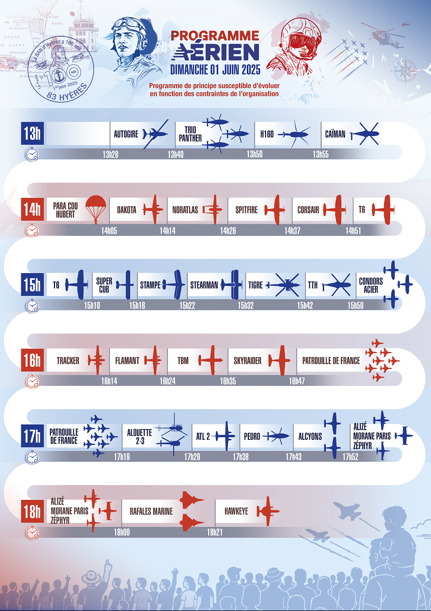 Découvrez ici dessous le programme aérien de la commémoration des 100 ans de la base d’aéronautique navale d’Hyères avec la participation de la Patrouille de France et des aéronefs de l’Aéronautique navale. Celui-ci peut être amené à évoluer à tout moment en fonction des aléas techniques, opérationnels ou météorologiques.